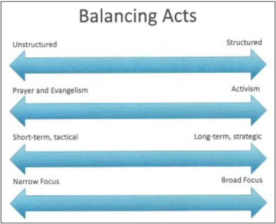 During an interactive session of the meeting on March 30 the participants were polled on the approach to implementation of the Christian Worldview Coalition. For each of the four options it was like a balancing act (see figure on the right). The group was inclined toward unstructured versus structured, long-term strategic versus short-term tactical, broad focus versus narrow focus and even on prayer versus activism. The comprehensive conviction of the group was to form a broad based, long-term, loosely designed coalition. The question arose, could this kind of coalition function without strong leadership at the top?